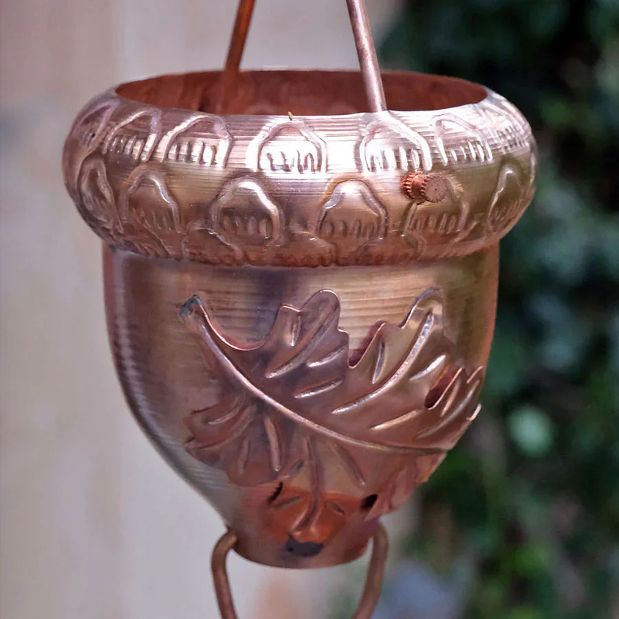 The Autumn Oak Rain Chain is an exclusive design that will complement any home! This functional, pure copper rain chain is hand tooled to resemble an acorn. Oak leaves adorn the sides of each cup adding to the overall beauty. To prevent damage in transit and reduce packaging volume, the upper wires are shipped separately from the cups, so some assembly is required. Each rain chain comes with a matching v-hook. The v-hook sits inside the gutter opening to hold the rain chain in place