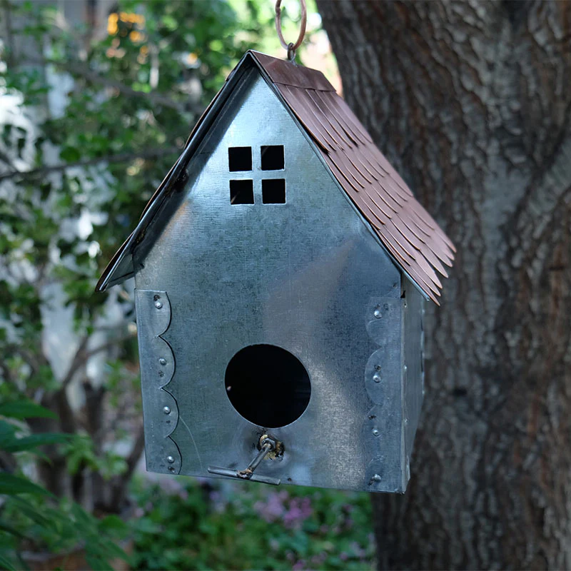 This cute little birdhouse of galvanized metal and pure copper will add whimsy and charm to your favorite bird watching area in your yard. The shingles are made of pure copper and will patina over time. The galvanized metal gives it a rustic, farm appeal. The side door makes for easy cleaning and access and the small perch is included for your feathered friends to rest or launch.