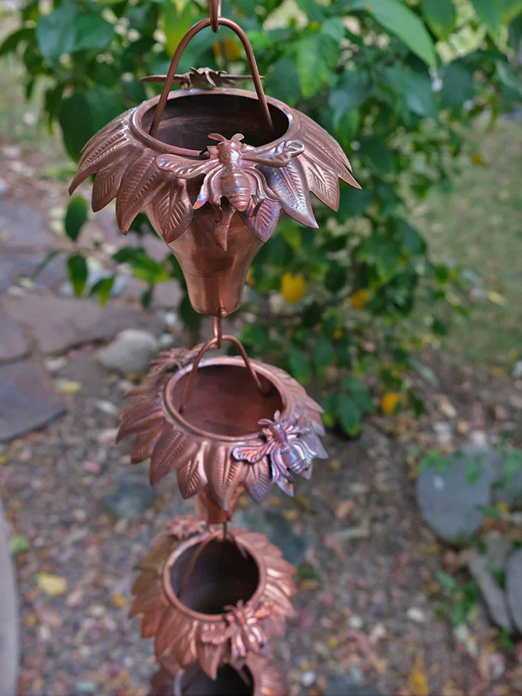 The Sunflower Copper Rain Chain has detailed petals that ring the top of the pure copper cups, with two copper honeybees perched on top! This rain chain will patina beautifully over time.